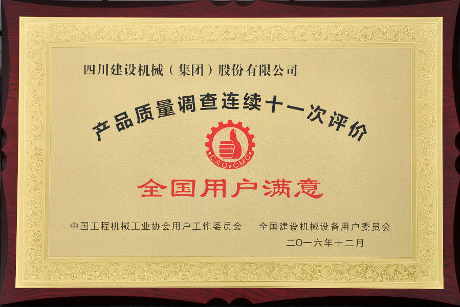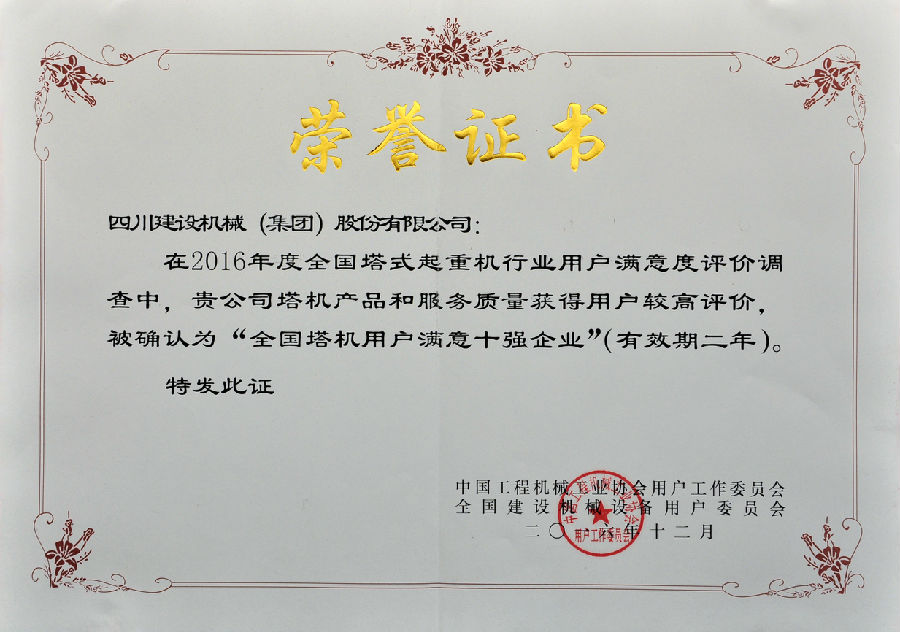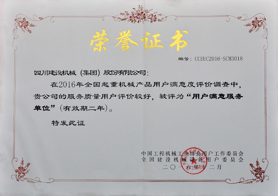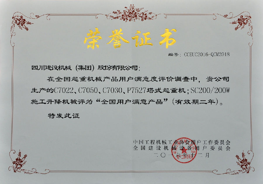 2016年全国用户满意产品评价测评结果公布,华球入口凭借良好的产品和服务质量获得全国用户的较高评价,荣获了“全国塔机用户满意十强”企业;获得产品质量调查连续十一次评价“全国用户满意”企业;公司生产的C7022、C7050、C7030、P7527塔式起重机以及SC200/200W施工升降机被评为“全国用户满意产品”;同时获得“用户满意服务”奖;1989年至今川建已连续十一次获得全国用户满意奖,得到了业内用户的高度认可。