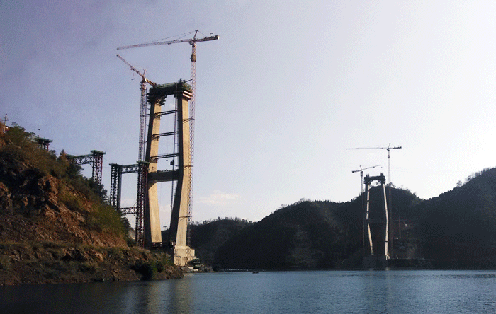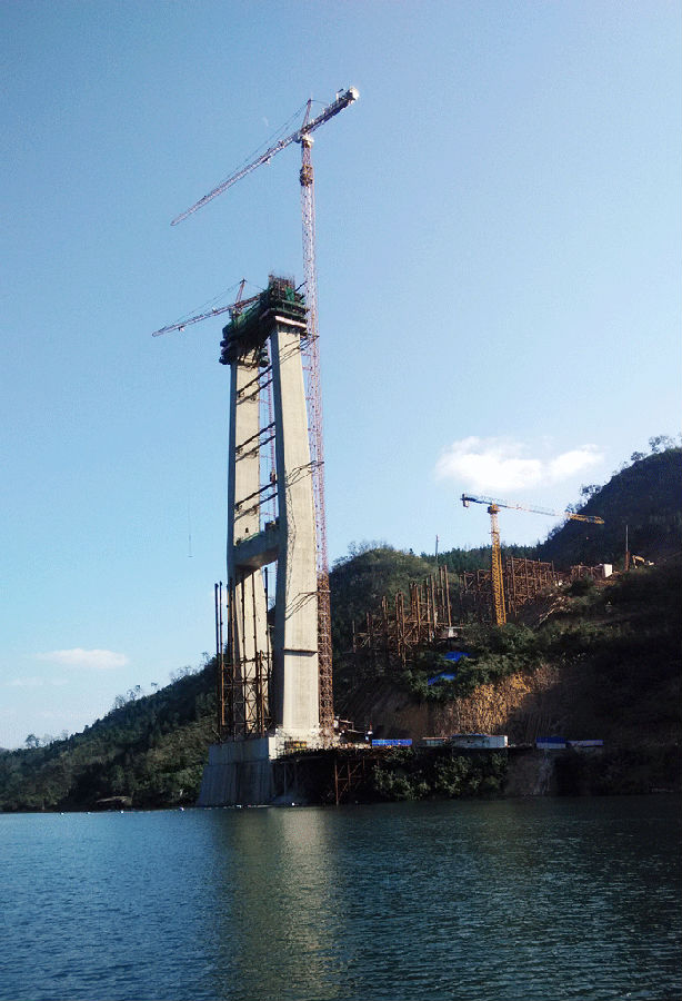 红水河特大桥两侧桥墩高度均为210米,每个桥墩的起重机械配置均为川建生产的一台C7036塔机、一台C7030塔机和两台SC200/200WPZ中速变频施工梯,副墩的施工机械为一台P125平头式塔机。