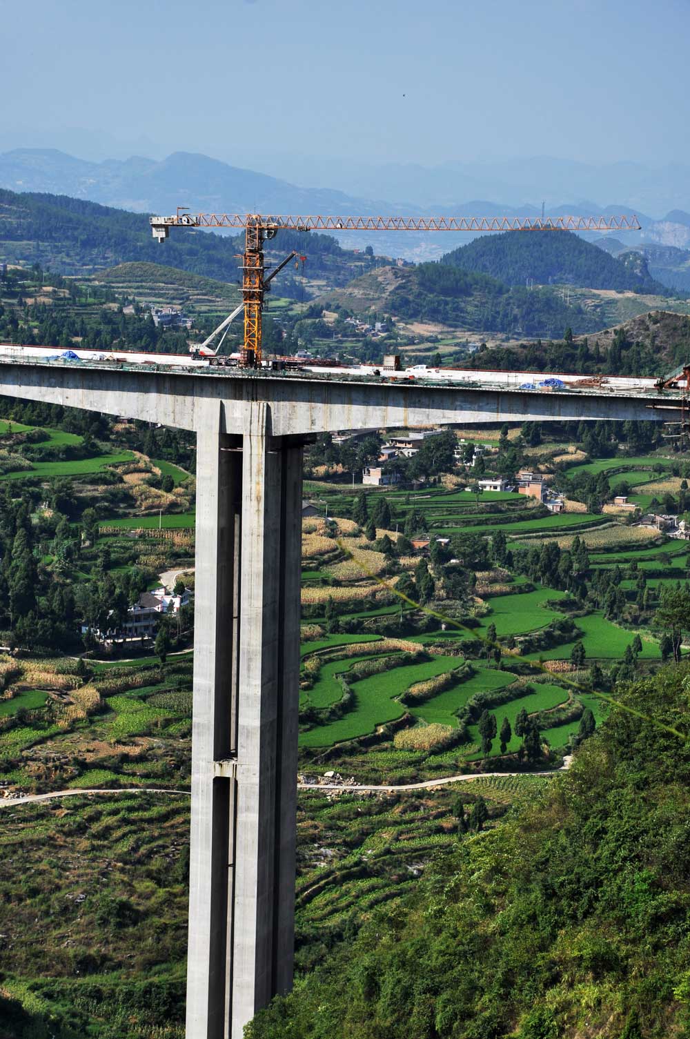 关寨大桥,全长998.08米,最大墩高102米。参与该桥施工的P125塔式起重机为固定附着式,起升高度达120m,最大吊重10t,端部吊重1.5t,最大工作幅度60m,标准节采用2m断面,是华球入口自行设计研发的新型平头式塔机,该机采用LVF变频起升机构,X系列变频调速变幅机构,RCV回转变幅调速机构,机构的配置均为公司多年来潜心研制的,具有国际同类先进水平的技术性能,运行平稳、操作简便、构造简单、故障率低、维护方便、安全可靠。