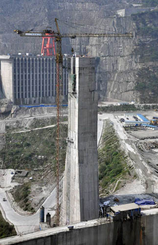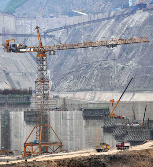川建塔机M1500、M900、3台C7050、2台C7022共7台参与施工。主要用于升船机标段、380标段和坝体的混凝土浇筑,兼顾钢筋、模板吊装等作业。